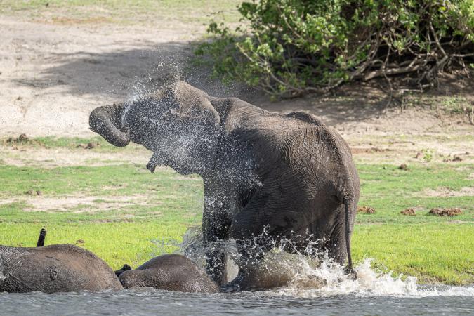 jacana à poitrine dorée. A bout d’1h30 de navigation, notre «souhait» se réalise : un troupeau d’une vingtaine d’éléphants longeant la rivière,