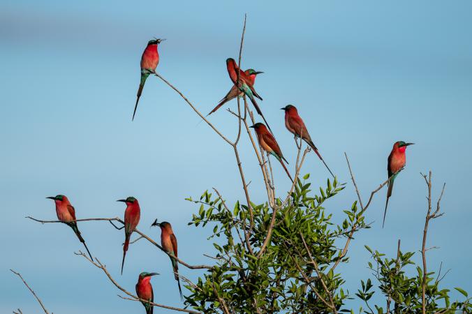 On voit un arbre tout rouge : il y a plein de guêpiers carmins.
