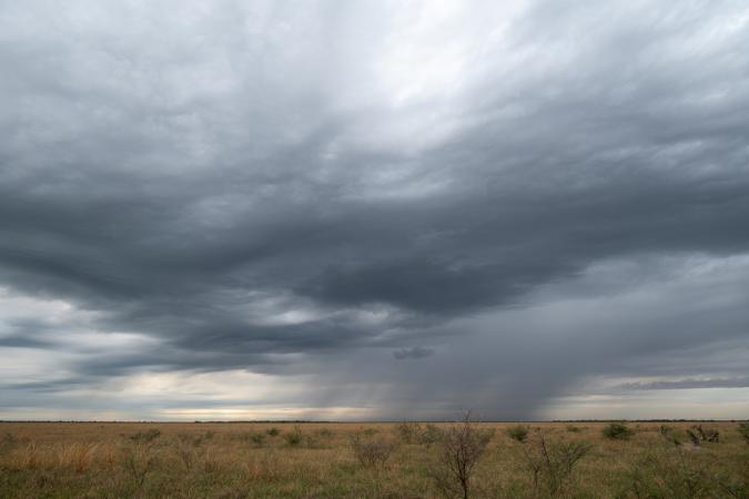 on aperçoit, de nouveau, des otocyons. Vers 8h00, il se met à bien pleuvoir, on ferme les fenêtres du 4x4. Vers 8h30, on stoppe quand même pour un petit-déjeuner express sous quelques gouttes de pluie. C’est reparti : outarde houppette, antilope rouanne (ça ressemble un peu à un oryx avec son masque noir et blanc sur la tête mais les cornes sont différentes).