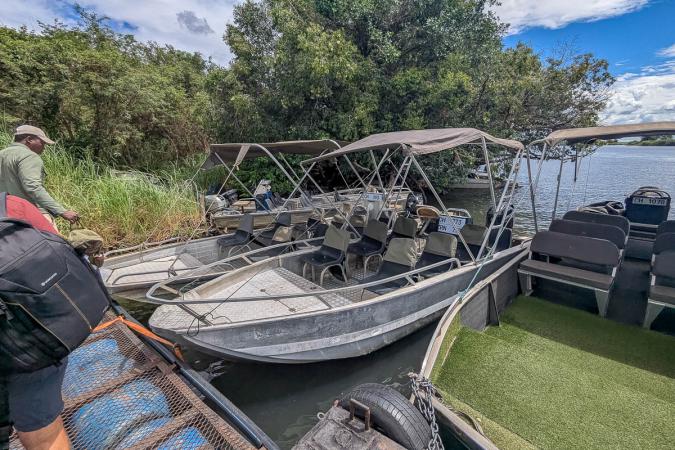 On va au restaurant «The Old House B&B» (3 étoiles) pour le déjeuner : pizza pour les gars, sirloin frites pour moi (un peu dur le steak). On repart à 13h35. On a rendez-vous à 14h00 pour un tour en bateau sur la rivière Chobe. Ca va être cool, enfin, on espère ! On se gare sur un parking qui «n’paye pas d’mine» et on embarque à 13h50 dans un bateau plat de 8 places.