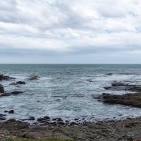 This small white lighthouse with its red door overlooks a small cliff. It's easy to walk down to the beach. At low tide, the rocks are covered with green seaweed, which turns almost fluorescent in the sunlight.