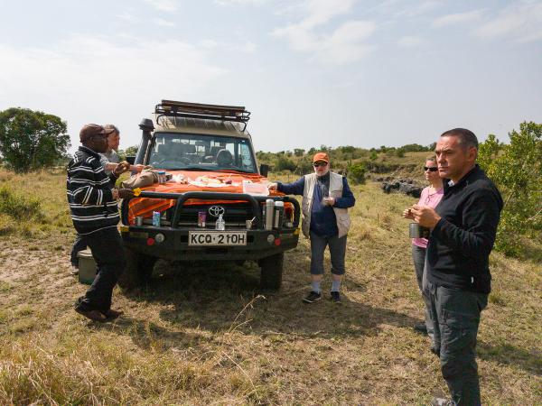 then 2 lionesses with 2 babies even smaller than the others. The guide did not know that they were there, we are all alone to observe them. But that does not last because David warned by radio the other drivers. Last breakfast at 8:30 am at the edge of the Mara river.