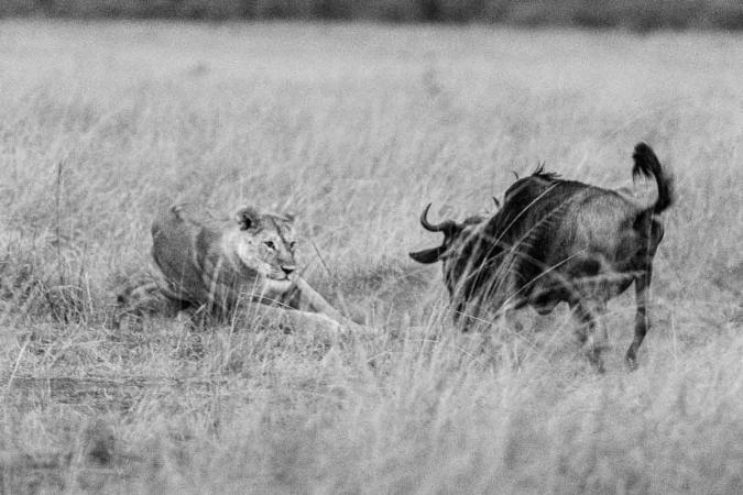 In Paradise Plain, we stop at the lioness hill. There are 13 lionesses and cubs. Around 5:30 pm, all this small world goes down from the hill. Waouh! A lioness goes hunting for a wildebeest. It starts to get dark and the cameras have a hard time to focus. That's it, the lioness runs away and the wildebeest runs away, then holds its head,
