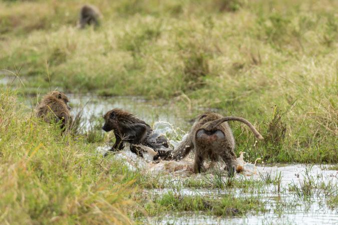 Poof, the little one falls. The mother licks her but when a car arrives, she gets scared and runs away. The baby, still stuck in his pocket, can't follow her. Fortunately, she returns. We leave them quiet and we go away. It is great to attend a birth in live. What a moment! Return at 12:30. Classic afternoon: hyenas, baboons,