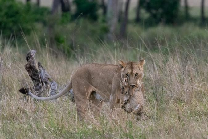 We cross the road of a lioness and 2 babies of 3,5 months and a roller. We arrive in the area of Paradise Plain at 8:15 am where we see crocodiles in the Mara river.