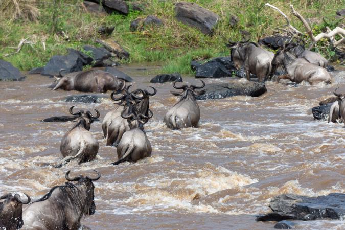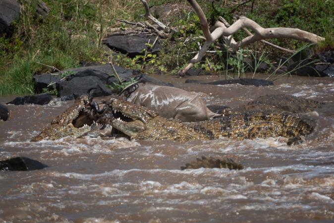 During the crossing, 2 or 3 zebras and wildebeest are eaten by crocodiles, which are not very awake because some animals pass under their nose and they do not even pretend to catch them !
