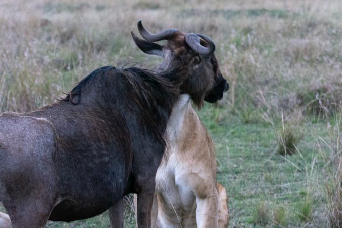 the lioness backs away and he goes back. What a mistake to turn his back to the lioness, he has no chance. I try to make a movie but I can't see anything because the focus is not right, too dark, but on the other hand, I can hear the sound of the heavy footsteps of the animals in full race approaching. The chase stops at 5 meters from our car. The lioness grabs the wildebeest by the neck.