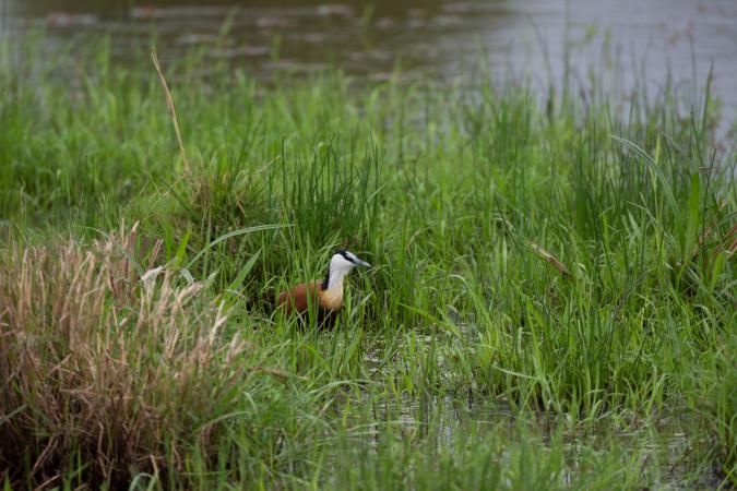 During the lunch, two new ones arrive. In the afternoon, behind the camp, there are 2 cobes and a baby less than a week old, the guide tells us. A hippopotamus dips in a pond. We remain in the sector and it is the "ornitho moment". We observe some kinds of ducks, a jacana with golden breast,