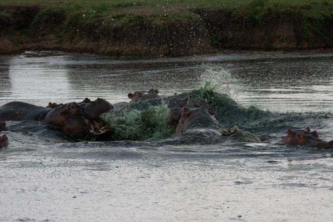 Then we return to Hippo Pool to take the aperitif with Edward and his safarists. They leave tomorrow morning early and go to the Lake Baringo. In the "pool", it is tense. Hippos are running at each other. They are not happy !