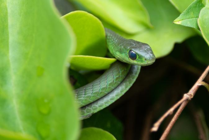 zebras, kingfisher. While passing a river bed, David turns back, he spotted a small green snake in a shrub. But how does he do that? It's a boomslang - apparently dangerous.