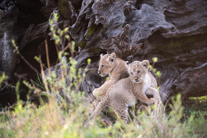 and the family of lionesses and cubs on their tree trunk. When we arrive, the cubs are all alone and then the mothers join them.