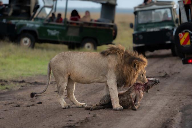 Alerted by the other drivers, we go to see a lion that holds a hyena in its mouth then deposits it on the track.
