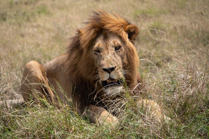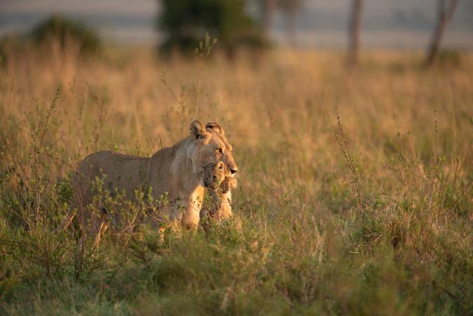 The poor mother turns back every time the little one squeaks. She hesitates, she turns back, she doesn't know what to do. She ends up giving up, she can't do anything anyway. Poor, it must be hard for her. It makes us sad but it is the law of the savanna. We cross then the way of a solitary lion on a small hillock...