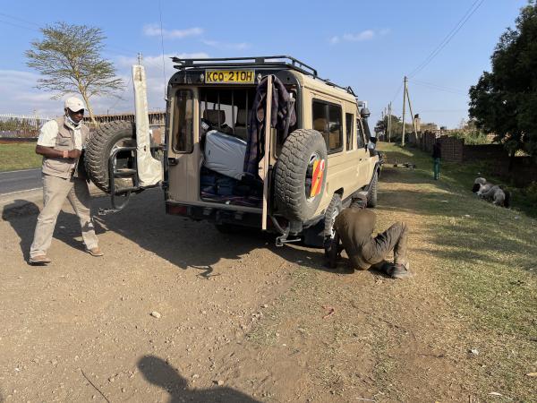 We buckle our bagages. Last lunch at 11:45 am. We say goodbye to Wilson, Benjamin, Passy, Samuel and the others and we leave the camp at 12:20 pm the ball in the stomach. We do not want to leave, we are too well here ! The road to Nairobi seems long. That does not speak a lot in the car, we think again of our wonderful stay, we fall asleep... As at the start of our trip, we make a pause pee in the same store of souvenir. Around 4:45, David stops the car on the road side, we have a flat wheel.