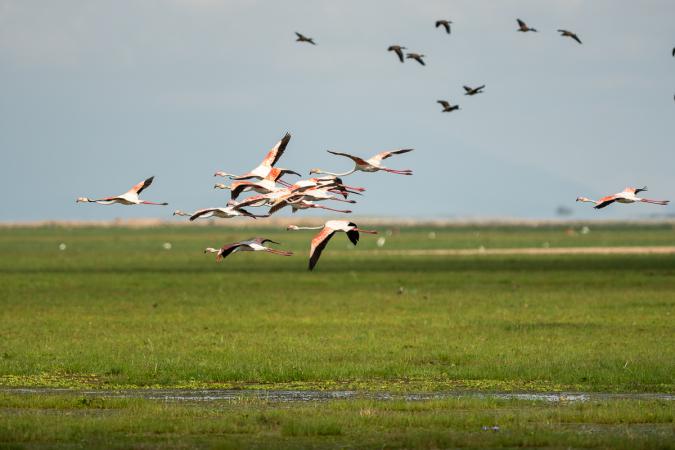 In the distance, we see a flock of pink flamingos. Then we come to rivers where there are many carcasses and a young hippopotamus killed by lions.
