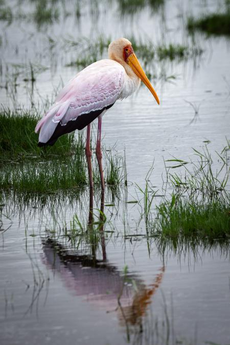 It's still very overcast and Kilimanjaro is hidden from view. Apart from the trees, we discover a very green park with shrubs and large flat areas. It rained in the weeks before our arrival, after a long period of drought. Some buffalo can be seen in the distance. Then we pass a sacred ibis fishing.