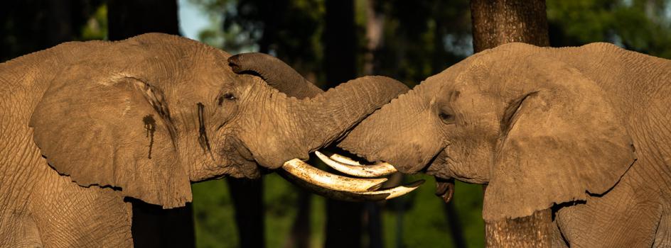 Our guide explains that Craig has such long tusks because he's never broken them in a fight. Another elephant arrives. His tusks are much smaller.