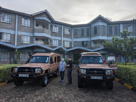 We take off for Nairobi at 12.45pm, half an hour late. We arrive at our destination at 9.30pm (+1h compared with France). Customs cleared very quickly. On the other hand, we have to wait a long time for our luggage. And finally, Etienne's suitcase is missing. We do the necessary paperwork and join the Melting Pot Safaris (MPS) cab guys. There are already 4 people in the minibus. They're from Dieppe. We arrive at our first accommodation, the Roussel Gesthouse convent, at 11.45pm. This is the usual "drop-off" point for MPS. The nuns offer us a dish of spaghetti bolognese, which we share with the Dieppe people and get to know each other. Tomorrow, they're off to Baringo and then on to Masaï-Mara, where we'll meet them again. Then bed at 00:45. Big storm tonight.