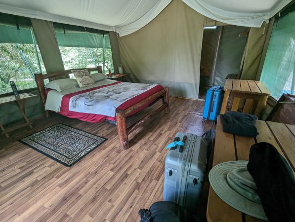 After loading our luggage, we leave the convent at 7.45 a.m., heading for Amboseli. The sky is overcast, but there are a few sunny spells. After almost 5 hours on the road, we finally arrive at Kibo Safari Camp Lodge, located just outside the south-east entrance to Amboseli National Park. It's a heavy day. We're welcomed with refreshing towelettes and a fruit juice. We settle into tents n°2 (us) and 3 (Etienne and Stephane). It's super elegant. The rooms are more like huts than tents, with hard floors and straw roofs, and tent canvas on the sides. It's very comfortable.