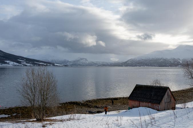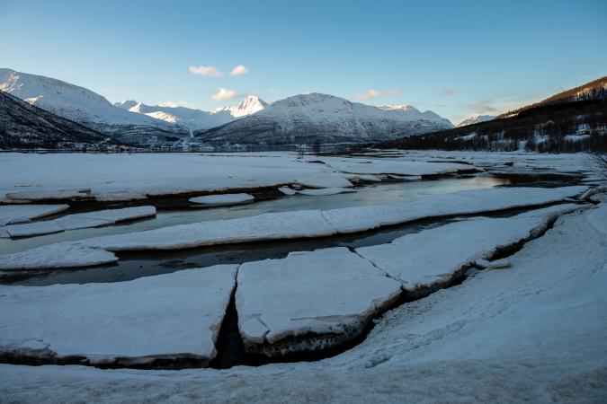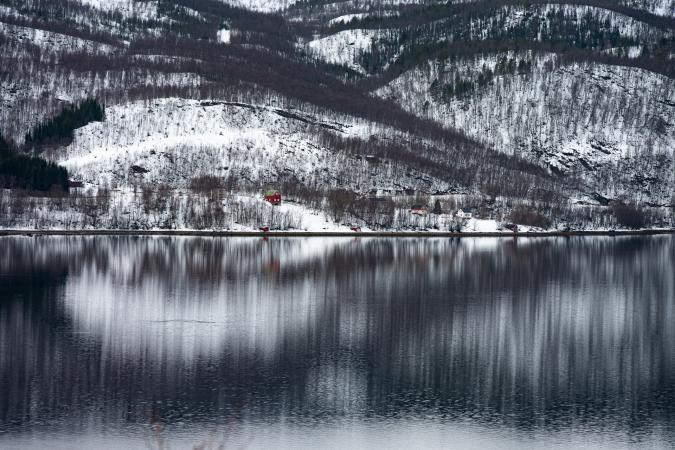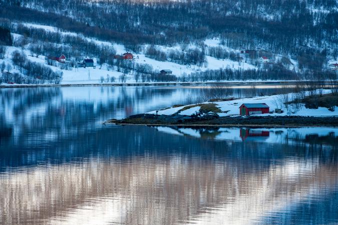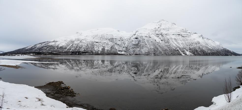 C'est magnifique. Et ces reflets, waouh ! On reste un moment. Puis, en continuant le long de Balsfjord, en remontant vers le Nord, on s’arrête à Laksvatnet, le lac est gelé.