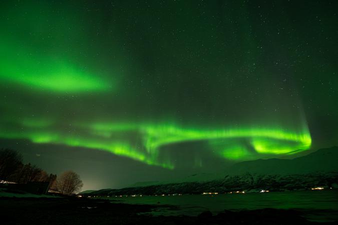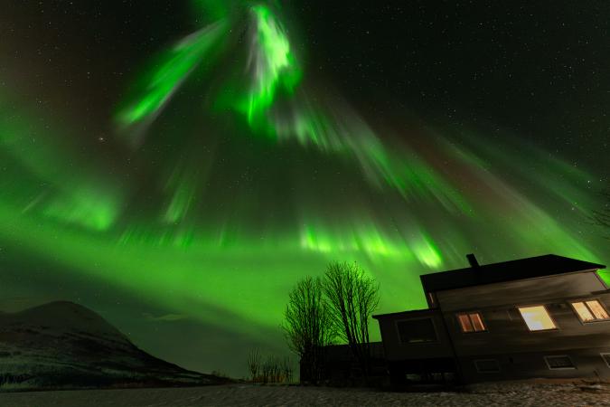 Retour à la maison vers 17h00. Tradition oblige, on fait une croziflette avec du reblochon amené de France. Dodo vers 23h00. Dans la nuit à 1h45, je me lève pour aller aux toilettes. En passant, je jette un œil par la fenêtre de l'escalier et j'aperçois du vert. Je vérifie par une autre fenêtre. En revenant au lit, je le dis à David qui va vérifier en faisant une photo. Cinq minutes plus tard, il réveille tout le monde. Et à 2h00, on est tous dehors. Le ciel est tout vert.