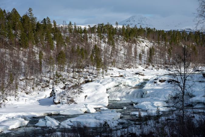 Vendredi 13 mars : debout à 8h30. Couvert et quelques gouttes de pluie. On part à 10h30. La pluie s'est arrêtée. On va voir la cascade Bardufossen mais elle est gelée et il n’y a pas de parking accessible. On file ensuite à la cascade Malselvfossen. Il y a un grand parking pour les camping-car et des sanitaires. La chute est grande, on a une première vue d'en-haut.