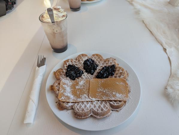 A 14h30, on s'arrête manger une gaufre aux myrtilles et brunost (fromage brun norvégien) avec un chocolat chaud au Yggdrasil Farmhotel Retreat & Spa. C'est une bonne adresse qu'on a bien retenu !