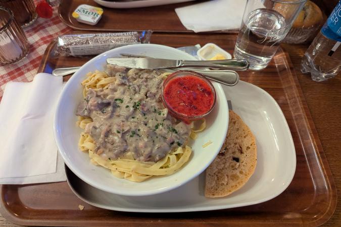 Demi-tour et arrêt à l’église Lakselvbukt pour un goûter rapide. On file ensuite manger à Nordkjosbotn au restaurant Vollan Gjestestue à 17h20 - pâtes au renne pour certains.