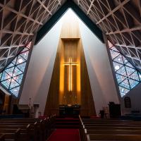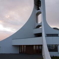 Petite église de la ville d'Olafsvik à l'architecture moderne. La route qui y mène est peinte aux couleurs de l'arc en ciel.
