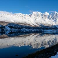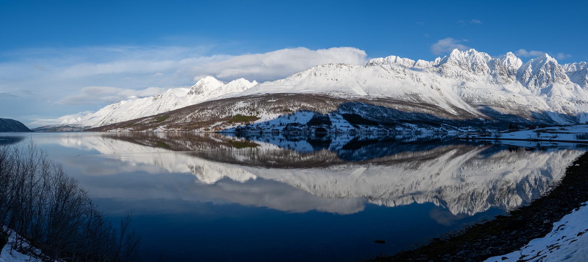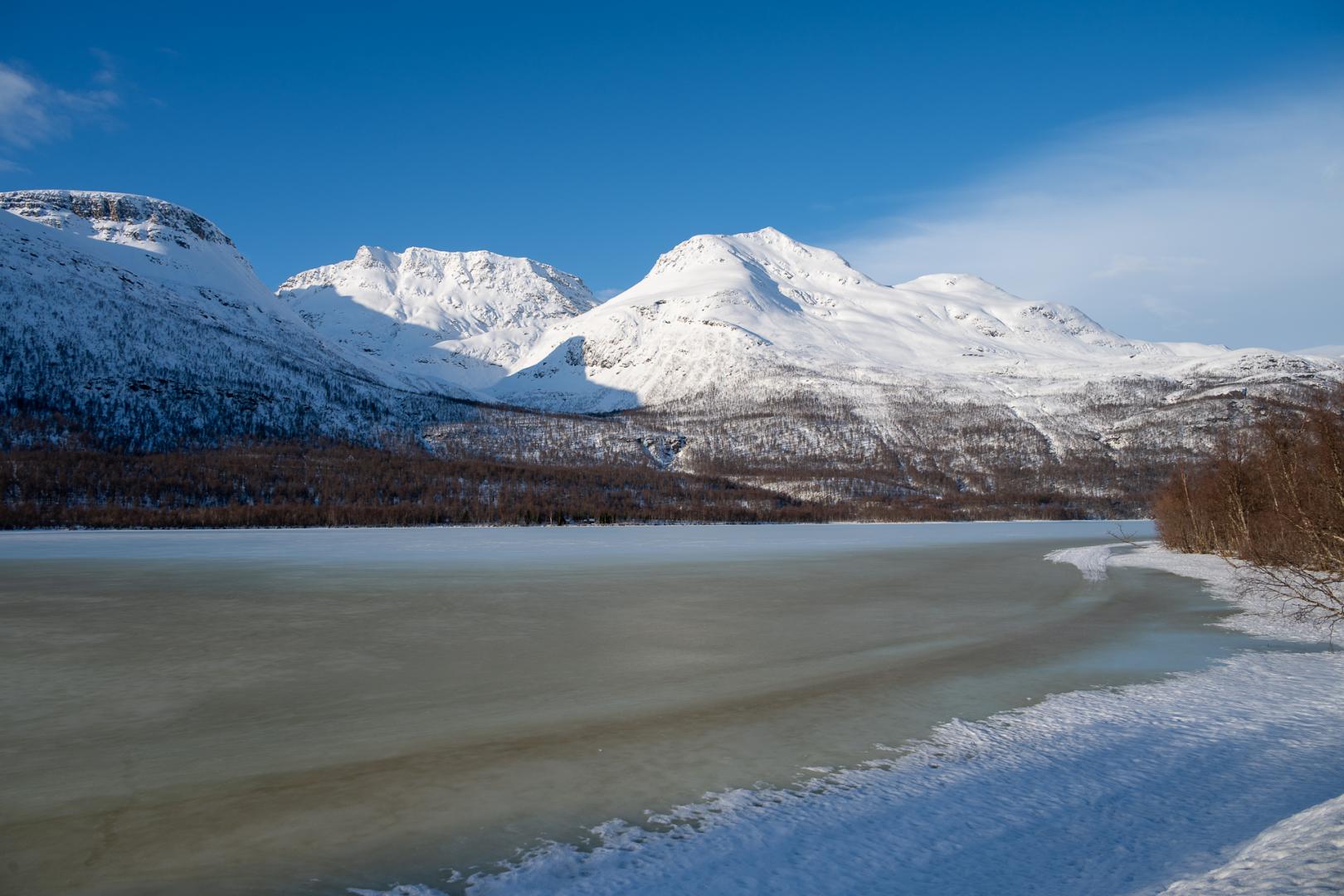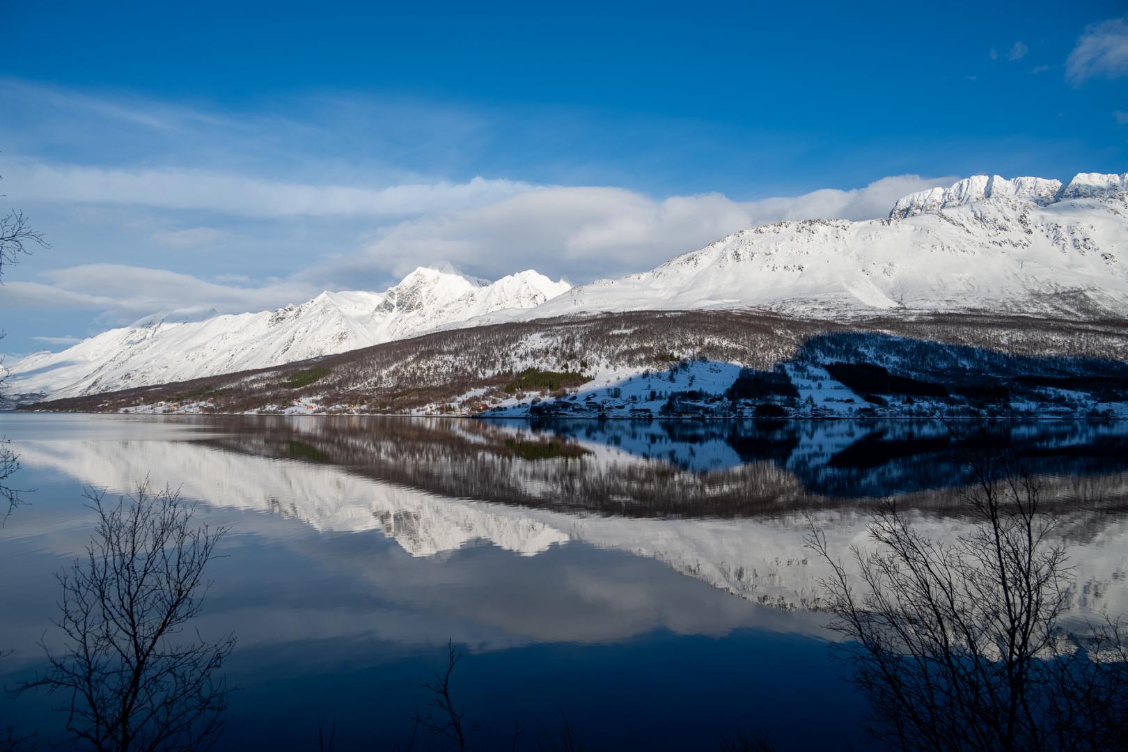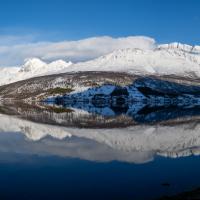 A 1h00 à peine de Tromso se trouve Sjovassbotn, début du fjord Ullsfjorden. On y a vu de très beaux paysages : débacle de glace, petit lac qui a "ses vapeurs", jolies maisons rouges en bord de fjord.