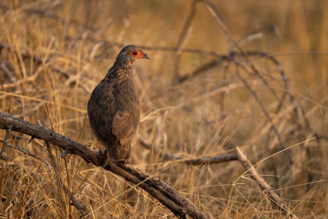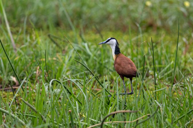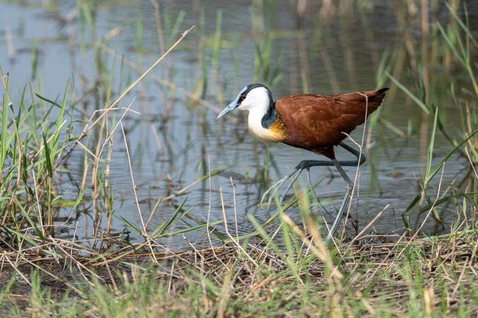 jacana à poitrine dorée. Quelques minutes plus tard, un hippopotame se montre en entier hors de l’eau. Francolin perché sur une branche, aigle bateleur juvénile,