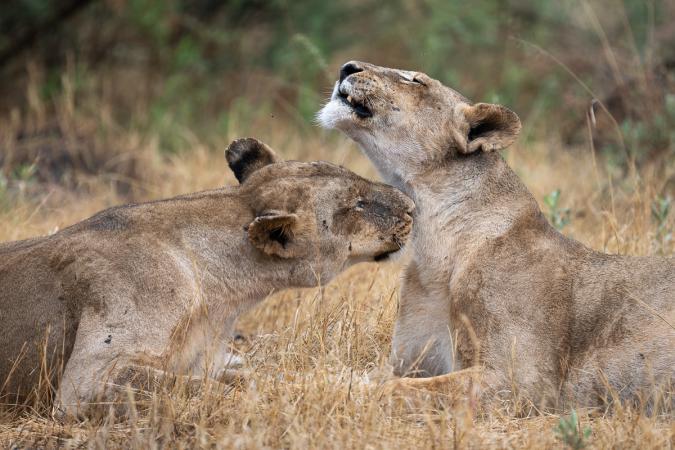 Après le gâteau, on repart en safari à 15h45 vers le Sud Est. Héron crabier, vanneau à ailes blanches, héron garde-bœufs, coucal du Sénégal agrémentent ce début de safari. Vient ensuite une girafe et une ouette d’Egypte. Plus loin, dans une partie dégagée du bush, on retrouve la même troupe de lions qu’hier. Là, ils sont 9 lionnes et 5 jeunes, vautrés ! Puis ça se réveille un peu.