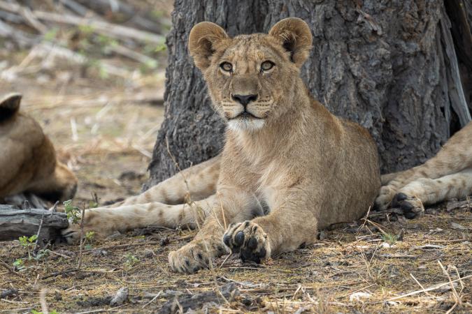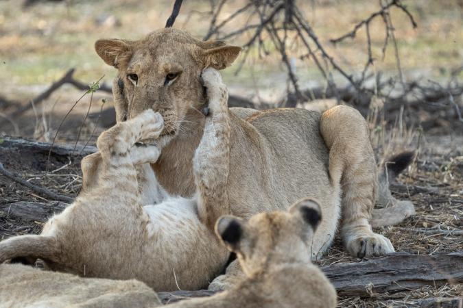 et on les suit un peu mais ils vont vite. On les laisse filer dans la forêt d’arbres morts. On va ensuite voir des lions. Un mâle et plusieurs femelles et petits.
