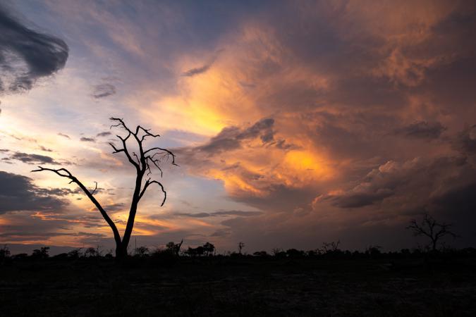 On arrive dans une zone dévastée : il ne reste rien d’autre que des troncs morts. On demande à notre guide s’il y a eu un incendie. Mais non, ce sont les éléphants qui ont tout mangé les acacias de cet endroit jusqu’aux branches, ce qui a fini de tuer les arbres. Enfin, à 18h00, on arrive au camp de Khwai. Dicks nous accueille avec des lingettes rafraîchissantes. Ca fait du bien. Le camp est top, plus ouvert dans une petite prairie avec de l’herbe bien verte et quelques arbres.