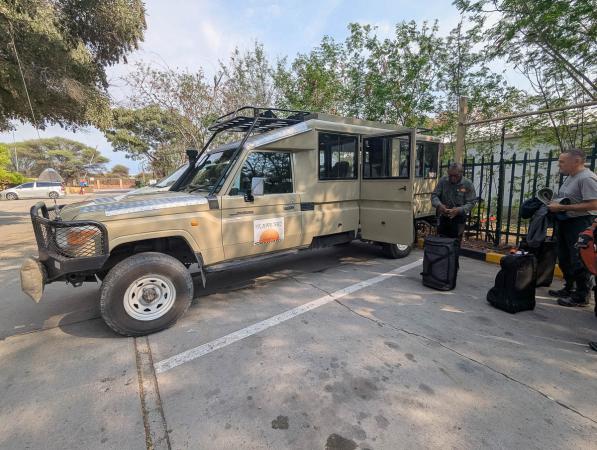 Mardi 4 novembre : debout à 6h00, petit déjeuner à 6h30 au restaurant de l'hôtel. Notre chauffeur guide de Kalahari Skies (prestataire de Let's Go Travel par lequel on passe pour ce voyage) vient nous chercher à l'hôtel à 8h15 pour débuter le safari. Il s'appelle Newman comme Paul nous dit-il ! Le 4x4 est un Land Cruiser avec une banquette et 4 sièges, toit ouvrant et grandes fenêtres qui s’ouvrent entièrement vers l’extérieur.