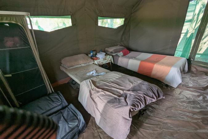 et légèrement à l’écart les tentes pour le personnel. Nos tentes «dodo» sont équipés de deux lits de camp avec des couettes chaudes, une petite table de nuit et d’une armoire avec moustiquaire. A l’arrière, une douche est installée