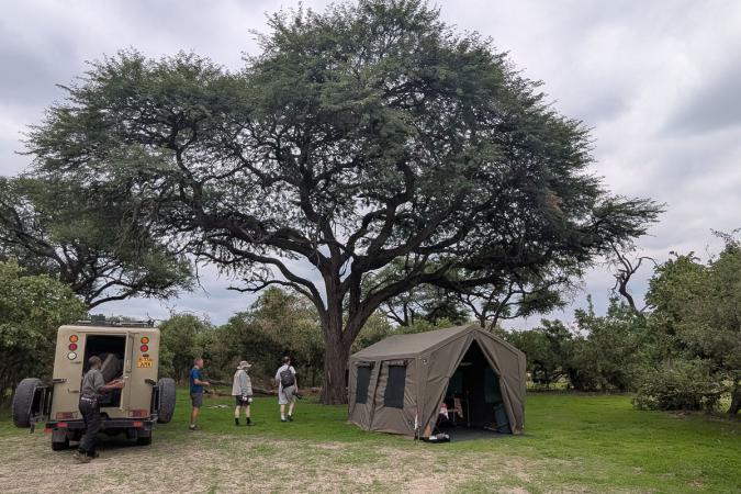 On arrive enfin à 17h45. On est accueilli par les 4 gars qui composent le personnel de camp (un intendant Dicks, deux cuisiniers Drims et Lorato et un aide de camp Sindi). Dicks nous apporte des lingettes fraîches, ça fait trop du bien ! Le camp est installé dans la forêt. Il se compose d’une tente «salle à manger», deux tentes pour nous quatre