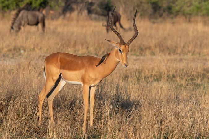 impalas, calao à bec rouge, choucador à épaulettes rouges se laissent photographier.