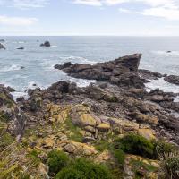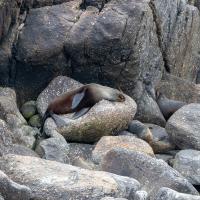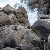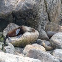 Un peu plus loin se trouve Tauranga Bay et sa colonie d'otaries. Le sentier longe la côte et arrive en surplomb de rochers ou se reposent des otaries.