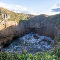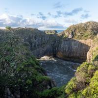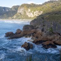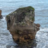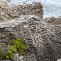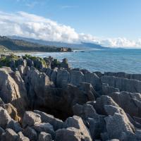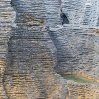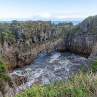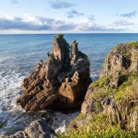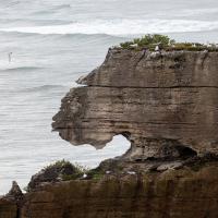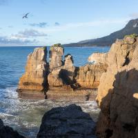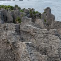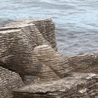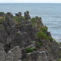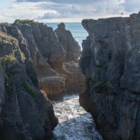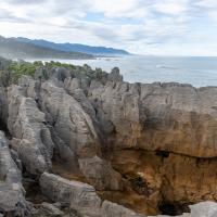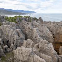 Pancakes Rocks est un des endroits surprenants de la Nouvelle-Zélande. Comme son nom l'indique, des rochers semblent être empilés comme des pancakes. L'eau s'engouffre aux pieds de ces falaises dans un fracas impressionnant. Des sternes et des mouettes nichent sur ces rochers.