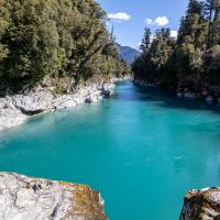Mais l'intérêt de cette partie de la côte est clairement la Gorge d'Hokitika. Après quelques pas en fôret et la traversée d'un pont suspendu le bleu turquoise de l'eau de la rivière provoque un wouah de surprise tant la couleur est incroyable. C'est vraiment très beau. Quelques pas de plus et le sentier descend sur une petite plage fréquentée... par de redoutables sand flies, des mouches qui piquent. Et c'est bien là la seule ombre au tableau de cet endroit magnifique.