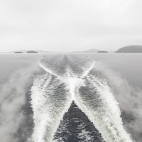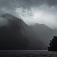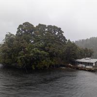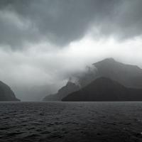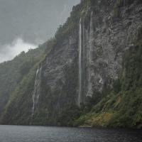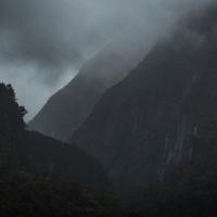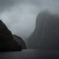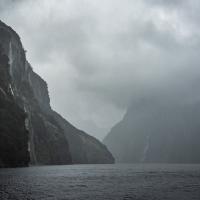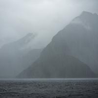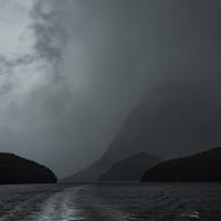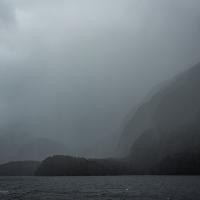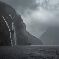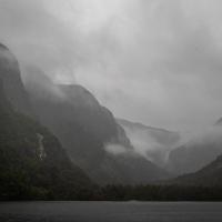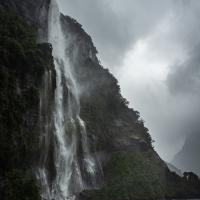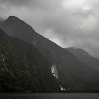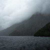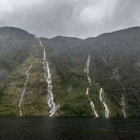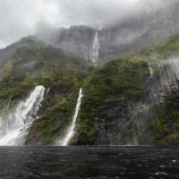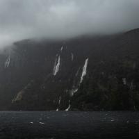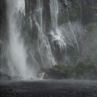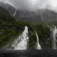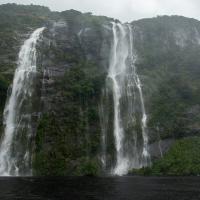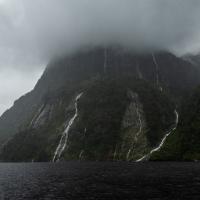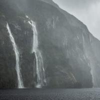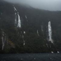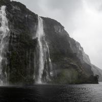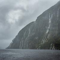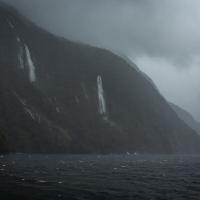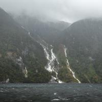 Au départ de la croisière à Manapouri, nous sommes quand même un peu inquiets car la visibilité est très réduite. Et plus nous approchons du fjord et pire ça devient. Mais une fois dans le fjord, la pluie et la brume donnent une ambiance mystique à cet endroit. Les sommets des montagnes sont noyés dans la brume, l'eau dévale les pentes avec un débit impressionnant, le vent pousse l'eau des cascades et donne à la pluie un angle quasi horizontal. Nous sommes trempés, mais enchantés par ce lieu et nous ne sommes vraiment pas déçus. Le lieu tient ses promesses et ne failli pas à sa réputation d'endroit très humide (il tombe ici 6000 mm de pluie par an ... oui oui, 6 mètres de pluie par mètre carré !!!) Au bout du fjord, là ou il rejoint la mer, nous apercevons, très loin, quelques pingoins et un dauphin qui fait des sauts dans l'eau. Après 3 heures d'une crosière magnifique, nous revenons à Manapouri, en espérant que nos photos restitueront cette ambiance et que le matériel n'aura pas pris l'eau.