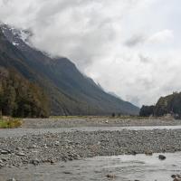 Tutoko Valley donne une vue sur une rivière aux eaux cristallines et les montagnes en arrière plan.