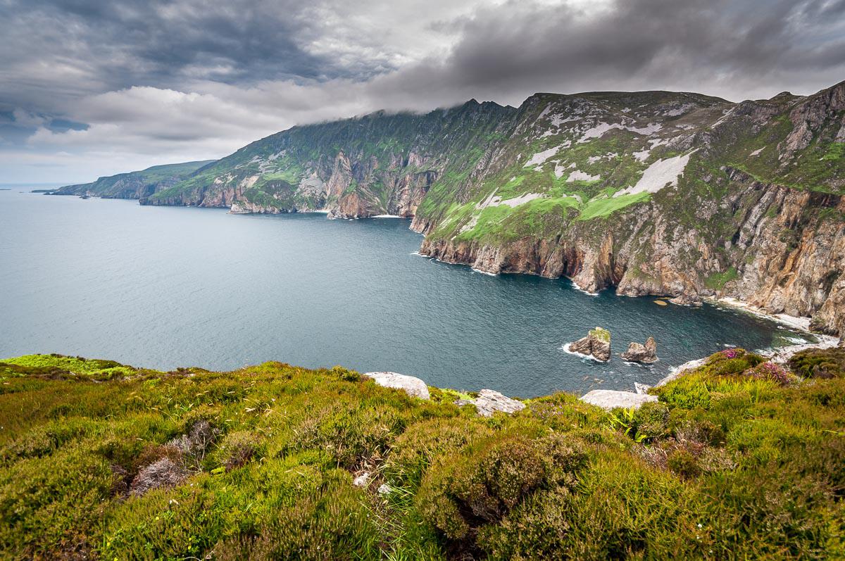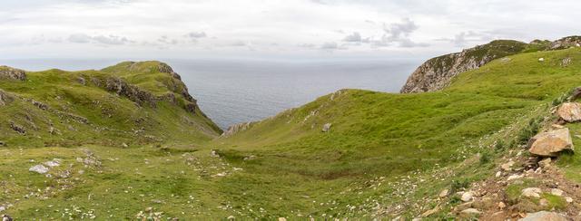 The sky slightly clears. We take the shuttle back and we take the Nature Trail (2 kms) close to the entrance. It's not very intersting if not a view of the lake and the Mount Errigal. We take our car at 3:45 pm to Donegal and the Atlantic Guesthouse. The room is very kitsch ans very small with 2 small beds side by side, sink and TV ; shower and toilet are on the landing. After leaving our bagages, we head to Glengesh Pass using the Wild Atlantic Way. We arrive at the pass at 6:45 pm, we take a few pictures and we drive to Slieve League. The road is pretty cool, small with a lot of turns. At 7:30 pm, we arrive at the entrance to Slieve League. We open a gate to enter and we walk along the coast.