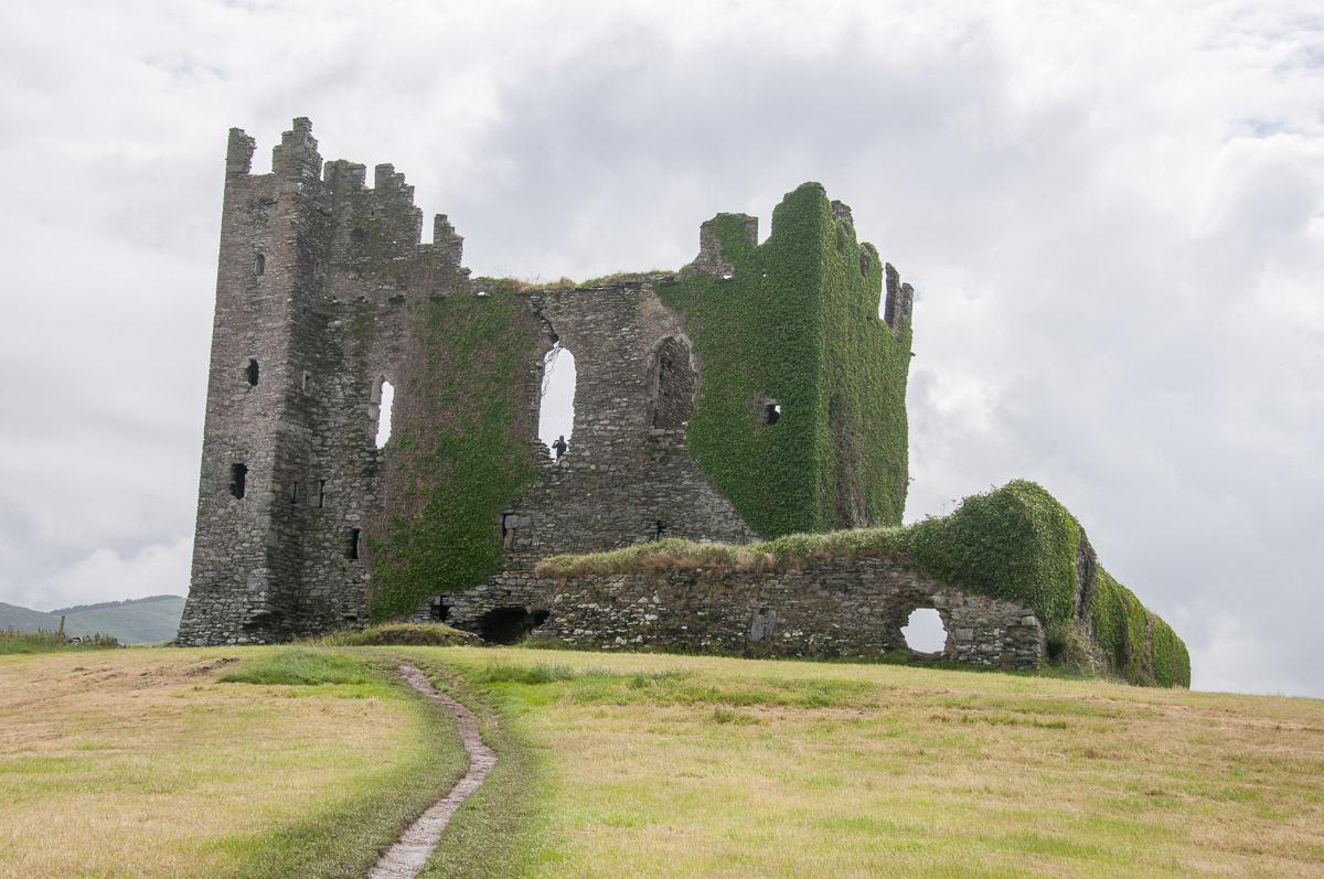 It is in very good condition. We go to a second fort but it starts to rain very hard. We take refuge in the car. Between two showers we see the Leacanabuaile Stone Fort. It is more fitted inside, it makes several rooms. It is nice. Continuing, we arrive at the Ballycarbery Castle, a beautiful castle ruin covered with greenery. It's very beautiful.