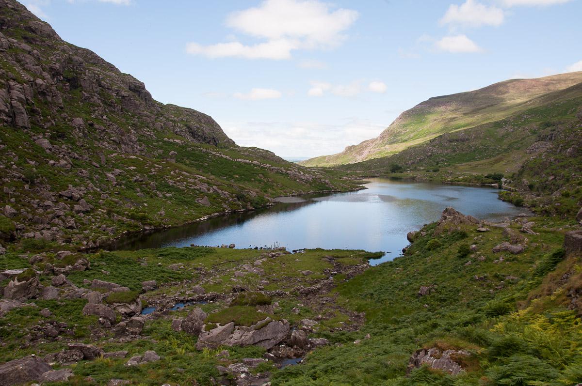 From here, we can see, in the distance, the Skellig Island, a place where some scenes of Star Wars were shoot. At 3 pm, we take the road again. Stop at Coomanaspic view point and then at St Finian's Bay, beach of surfers. We take the opportunity to nibble. Other stop at Coumanchiste view point. We made a quick passage to Cove Beach. It's full of people and caravans almost on the beach. On the south of the peninsula, we go to see the Staigue Stone Fort. We put 1 € per person in the box. It is not bad either. Good condition. Then we take the road R568 to Gap of Dunloe. We make pictures of the hill and its lake, then a river and its small waterfall. Arriving on the Gap of Dunloe, we make a lot of photos stops.