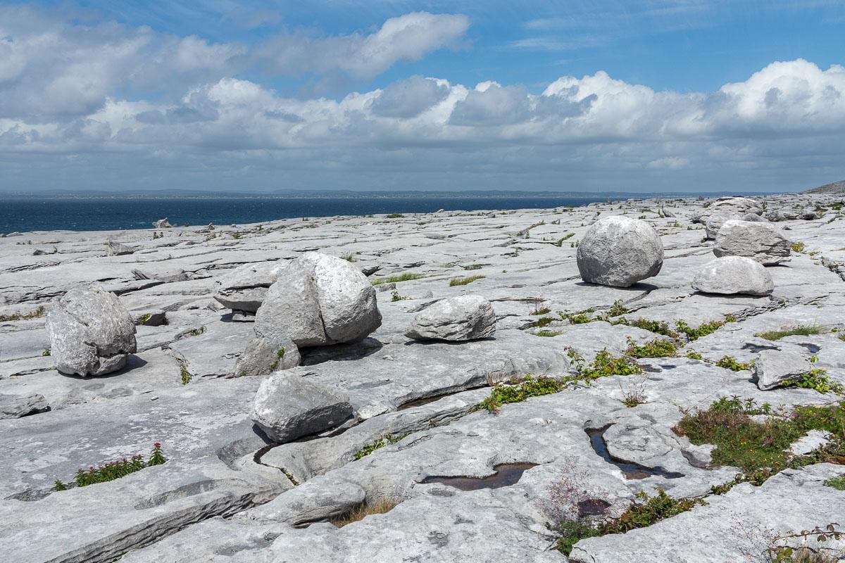 We leave Connemara where we saw a lot of french and sheeps on the road. We arrive in Ballyvaughan and we look for our hotel. In fact its name has changed : it's now the Wild Atlantic Lodge. The room is nice but the view on the iron roof is less. We go to visit the Burren. We drive along the coast passing by Black Head. It's an area of limestone with narrow cracks. It is very impressive. There are sometimes blocks in the form of large balls.
