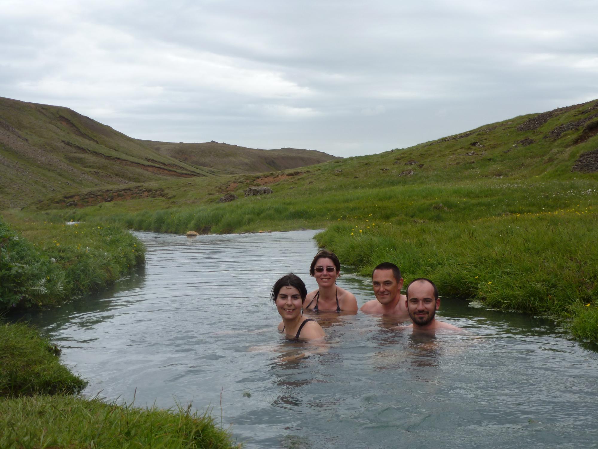 Lundi 27 juin : on part à 10h00 pour faire la randonnée de Hveragerdi et les sources d'eau chaude de Hengill (de 11h00 à 16h30). Elle fait une dizaine de kms dans un beau paysage verdoyant et montagneux. Sur le chemin du retour, on se laisse tenter par une petite baignade dans la rivière. Une rivière d'eau froide croise la route d'une rivière à 100°C, ce qui engendre une rivière d'une eau à ~40°C.