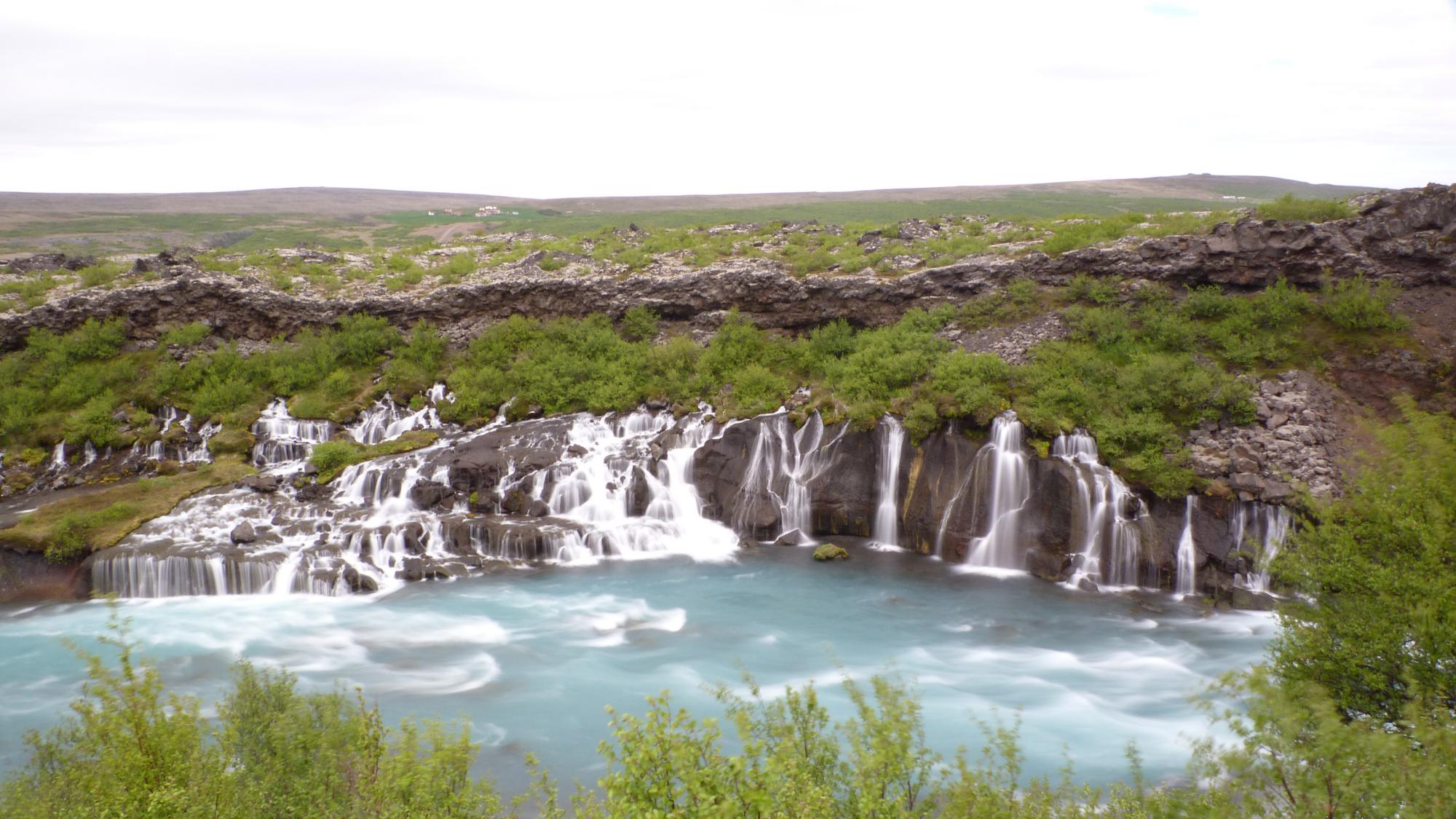 Dimanche 26 juin : on part pour les gorges de la Hvita. C'est couvert avec un peu de soleil et il fait 12°C. On se dirige vers le parking de Hraunfossar. Il s'agit de mini-cascades qui s'écoulent dans la rivière sur près d'1km. C'est magnifique.