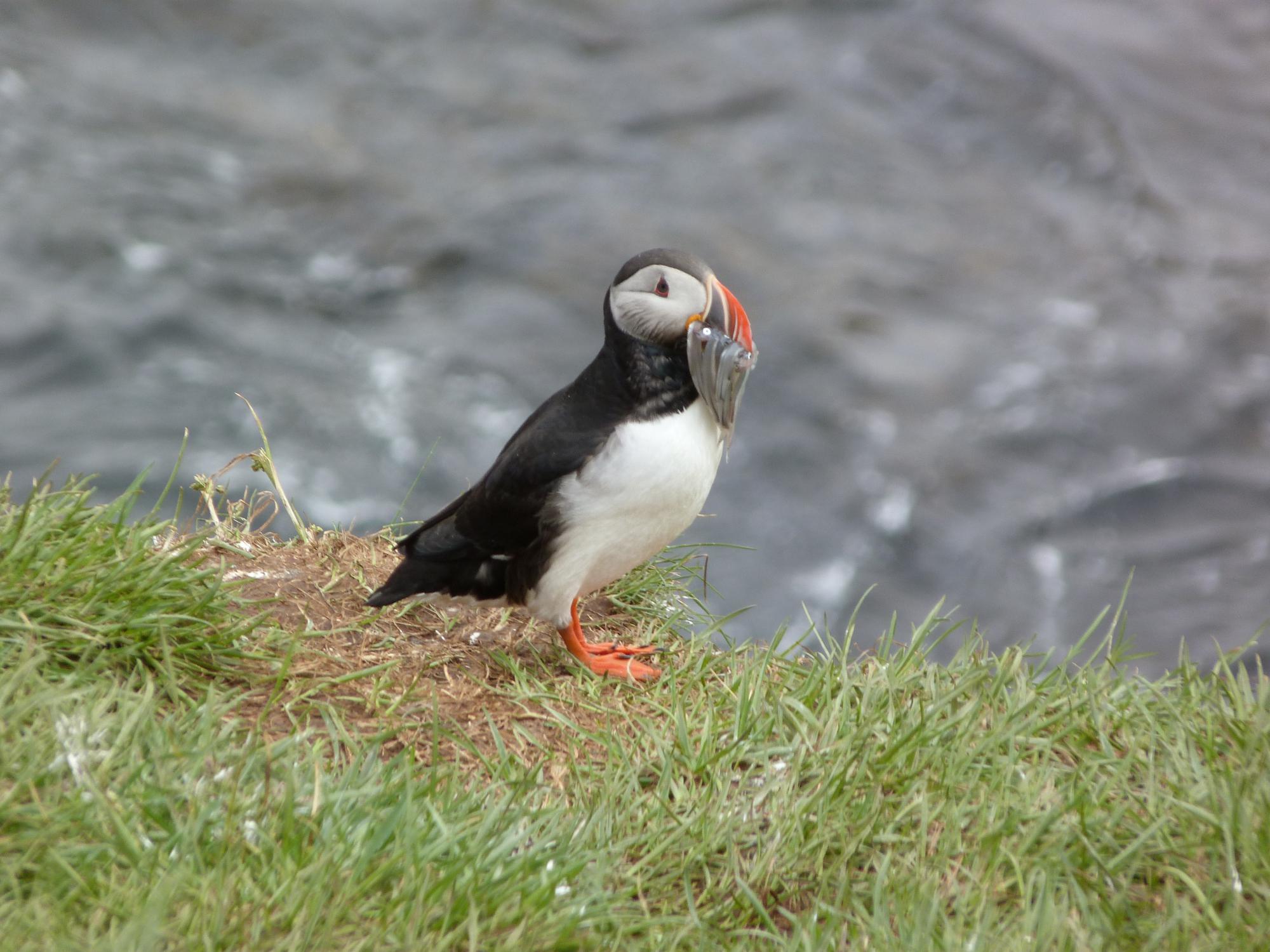 Lundi 20 juin : on va au petit village de Borgarfjordur. On visite l'église, puis on passe devant la maison typique végétalisée. Puis on se rend un peu plus loin (~5kms) à Hofn pour observer les macareux et autres mouettes, eiders. C'est le paradis des oiseaux. Ils ont leur petite colline herbeuse où ils nichent et font leurs petits. On peut les observer de très près.